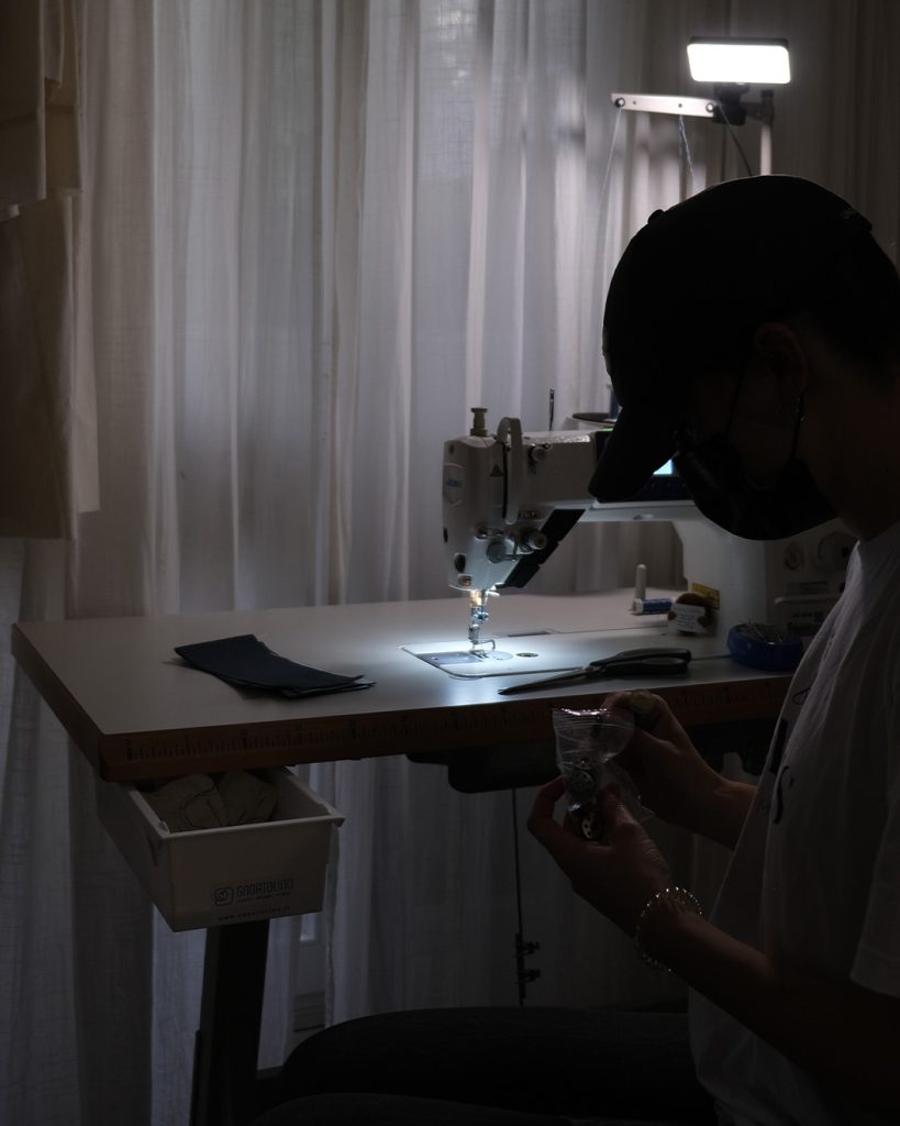 Chaque pièce est confectionnée à la main dans notre atelier du Val-d’Oise, uniquement à la demande, à partir de tissus upcyclés issus de maisons européennes prestigieuses.