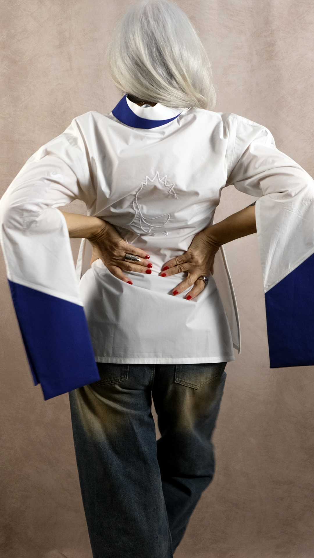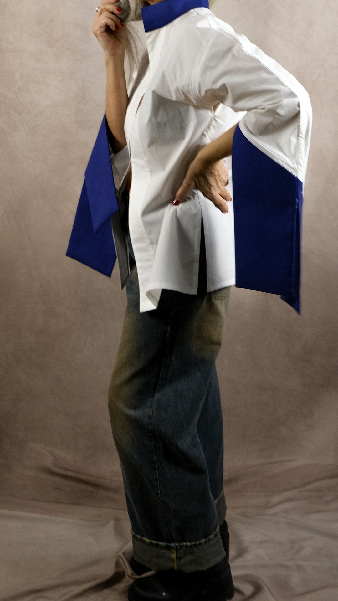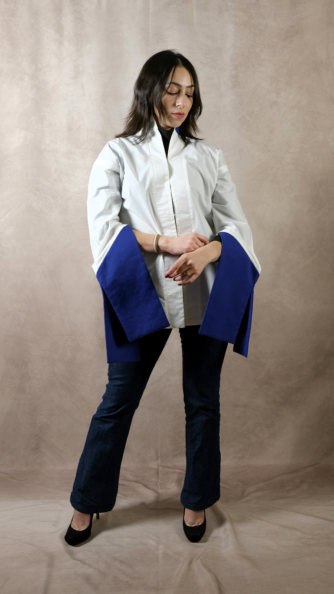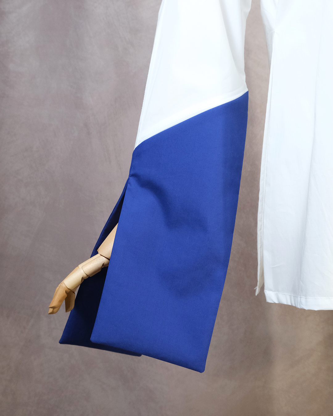 Le col mao bicolore apporte une touche graphique subtile, tandis que les manches bicolores s’ouvrent élégamment grâce à deux fentes.