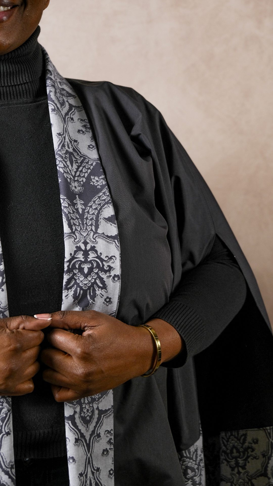 Ses manches fendues apportent mouvement et modernité. Les empiècements au bas des manches structurent la pièce, tandis que son col qui se replie sur lui-même crée une signature élégante et singulière.