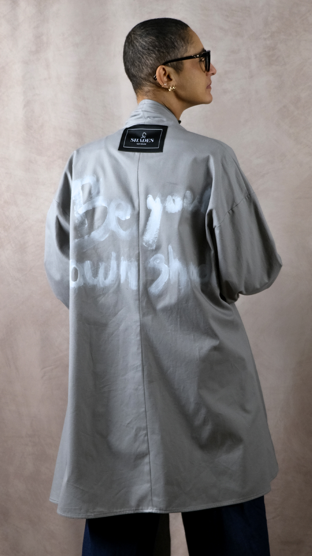 Au dos, la phrase “Be Your Own Shade” est peinte à la main par le créateur. Aucun tracé n’est identique. Chaque pièce est unique, sur mesure, intime.