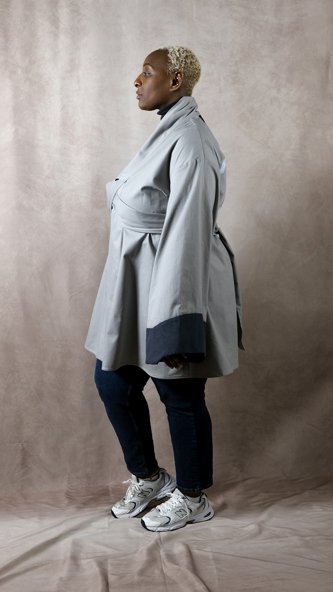 Ses volumes oversize apportent force et présence, tandis que les empiècements au bas des manches structurent subtilement la silhouette. Une délicate possibilité de nouage au dos, au niveau de la taille, permet d’ajuster la coupe et de souligner les formes selon votre envie.