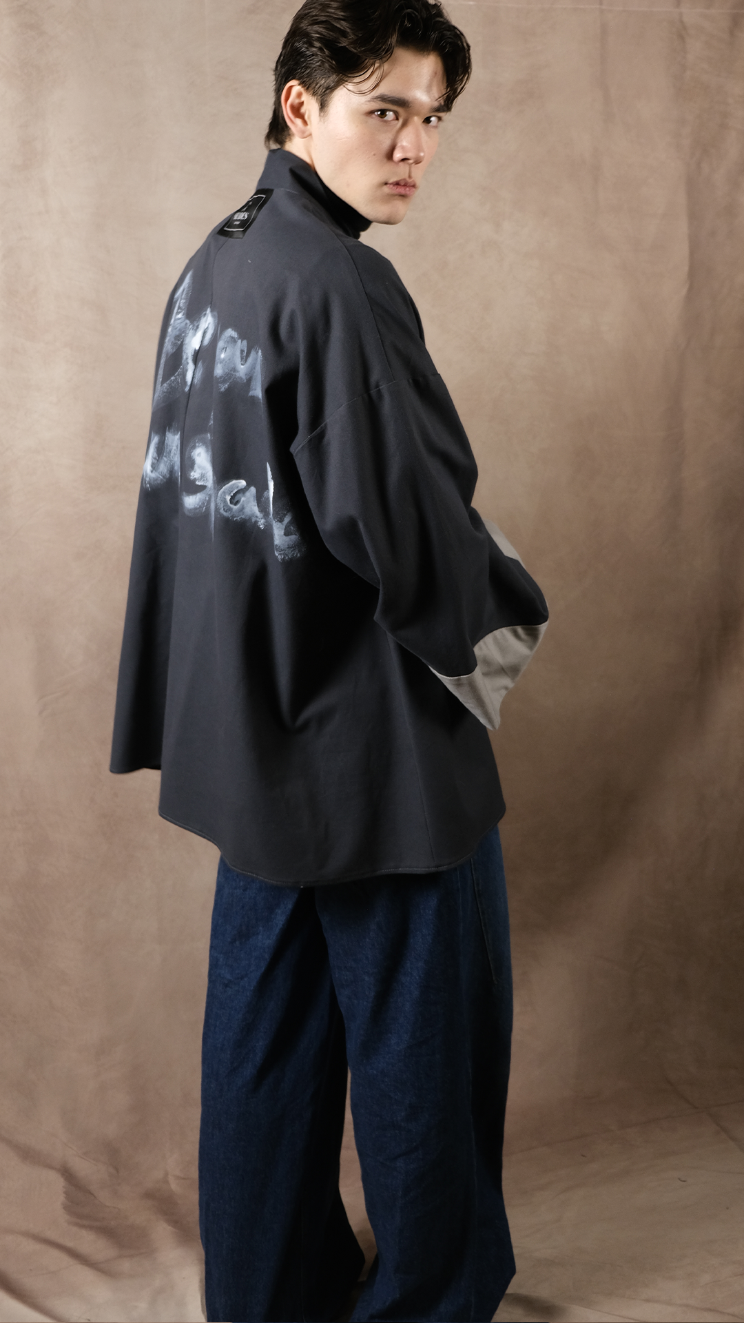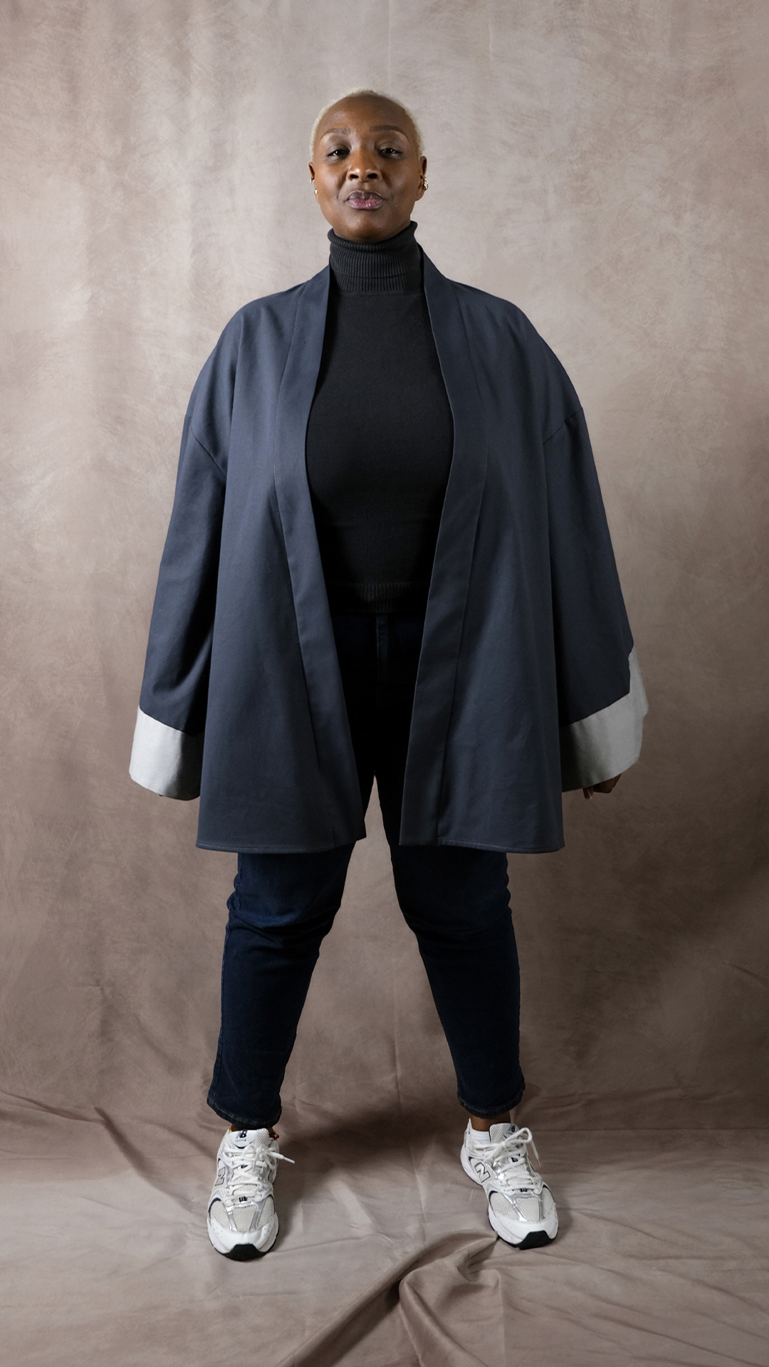 Sa coupe mi-longue et ses emmanchures oversize enveloppent le corps avec liberté et assurance. Les empiècements au bas des manches viennent structurer la silhouette tout en conservant ce mouvement fluide si cher à SHADES SUR-MESURE.