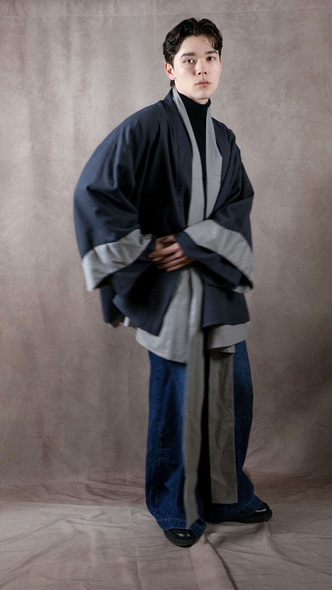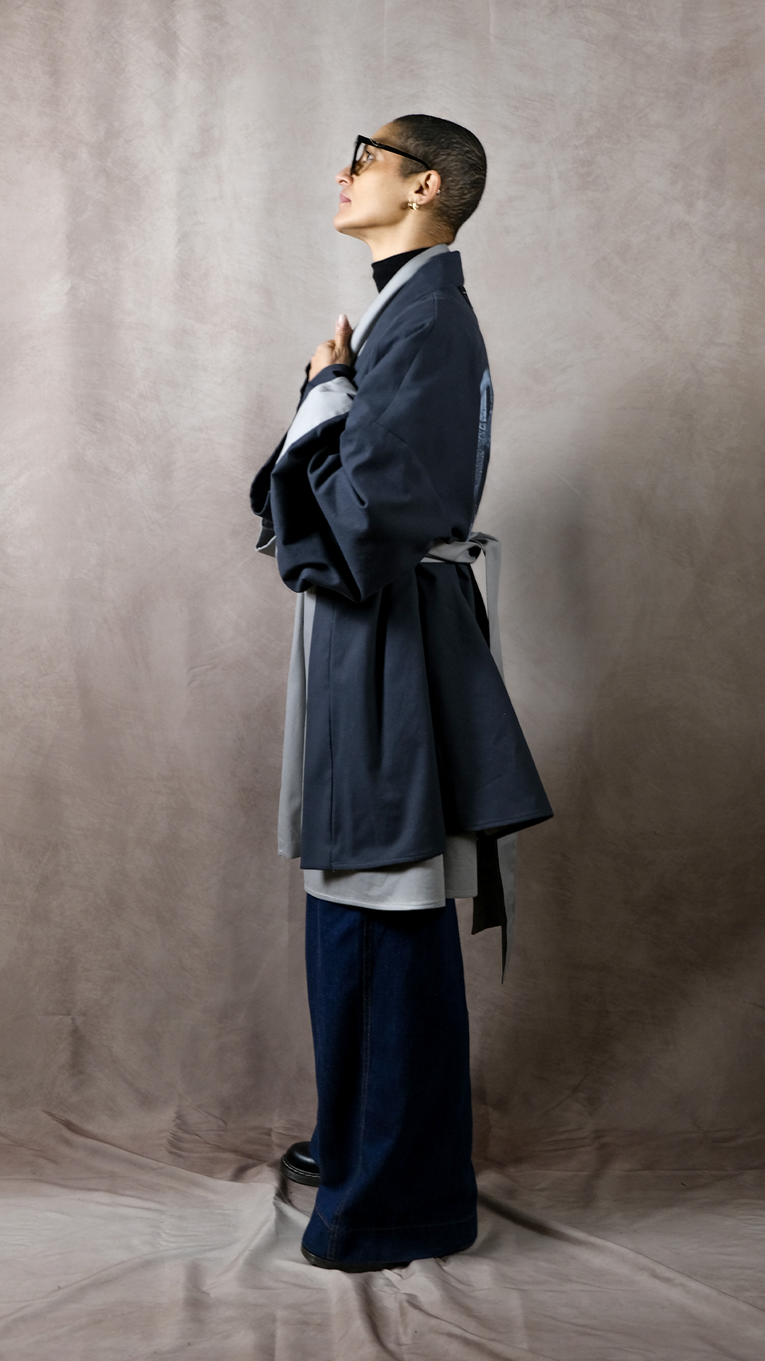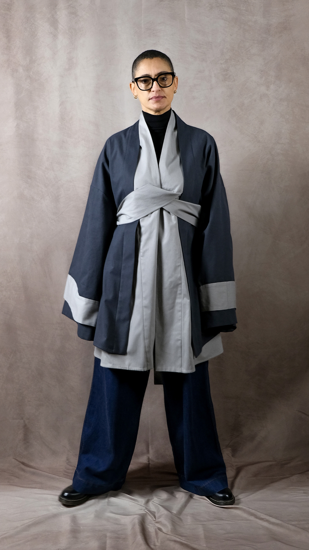 Le kimono double incarne la dualité et l’unité. Co-créé avec notre communauté, il a été imaginé à partir des tissus que vous avez choisis, puis conçu pour pouvoir se porter ensemble… ou séparément.